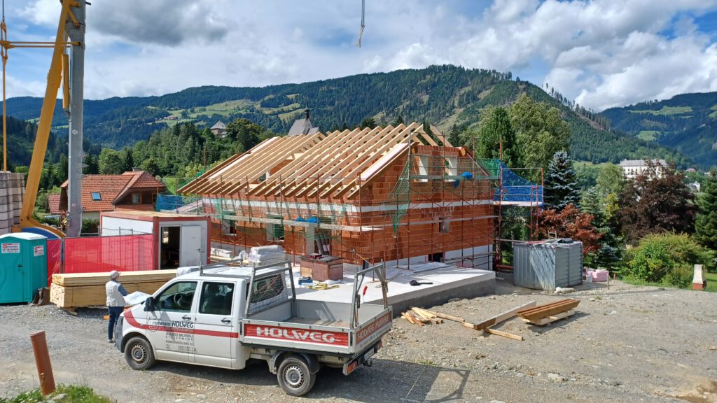 | Geleistete Arbeiten: | Aufstellen des Dachstuhls. |